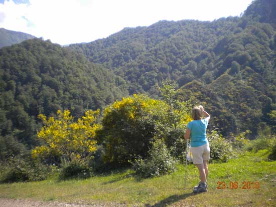 El valle del centro corresponde al reguero del Puerto. La loma descarnada en la margen dcha es la Travesona y por su cima va el CAMINO DEL SALVADOR (etapa Buiza de Gordón-Pajares pueblo) Toda la margen izquierda corresponde al bosque de Valgrande. Al fondo la Cordillera Cantábrica con la Mesa, en su zona central.